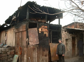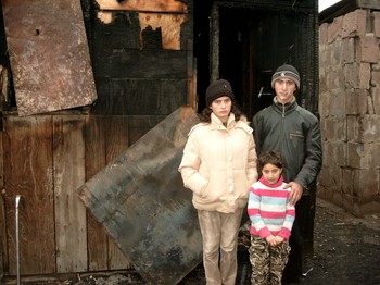 7 December in de avond is het onderkomen van de fam. Khachatryan uitgebrand. De moeder met haar drie kinderen zijn daardoor dakloos geworden. Deze familie komt niet aanmerking voor een nieuwe woning want ze staan niet op de lijst daarvoor. Ze wilden de familie ergens ver weg onderbrengen maar dat hebben ze geweigerd. Na 10 dagen is er door de stichting help de ouderen in Armenië geld verzameld voor een andere containerwoning. Hripsime Khachatryan : Door de houtkachel is de brand ontstaan. Er is niets bruikbaars overgebleven. Omroepster: Er woonden 4 personen in de 6m lange onderkomen. De moeder en drie kinderen. De moeder is ziek en ligt nu in het ziekenhuis. De kinderen slapen nu bij een tante. Sveta Khachatryan (tante): Ik woon met 9 personen in een klein onderkomen maar kan de kinderen toch niet op straat laten! Mijn broer is gestorven. Hoe moet ik hier nu mee aan? Omroepster: Tijdens deze dagen krijgen ze steun met geld en kleding. Ze kregen een container toegewezen door de gemeente maar die ligt zover weg dat ze daar niet mee akkoord konden gaan. En vandaag is er vlakbij hun uitgebrande onderkomen de nieuwe container geplaatst. Het bedrag is geschonken door de stichting help de ouderen in Armenië. Avetik Melik-Sargsyan: Mijn vrienden hebben geld ingezameld om de container en verdere benodigdheden te kopen. Ondertussen hebben wij zorg gedragen voor meubilering en andere nodige dingen. Omroepster: Het is erg belangrijk dat er een toilet gedeelte komt deze was niet in het andere onderkomen. Na een kleine renovatie is dit klaar, de zoon zal dit doen. Armen Khachatryan: Waterpijpen en rioolzal ik in het voorjaar in orde maken. Henrik Khachatryan (oom): Nu hebben de kinderen een groot onderkomen en ze zijn gelukkig ondanks dat de moeder ziek in het ziekenhuis ligt. Omdat de container heel goed is net zo goed dan de onze! Hartelijk dank hiervoor! Sveta Khachatryan (tante) We bedanken de sponsors dat ze de kinderen dit onderkomen hebben gegeven! Omroepster: Na het plaatsen van de container haastten de kinderen zich naar het ziekenhuis om hun moeder te vertellen over deze comfortabele container.